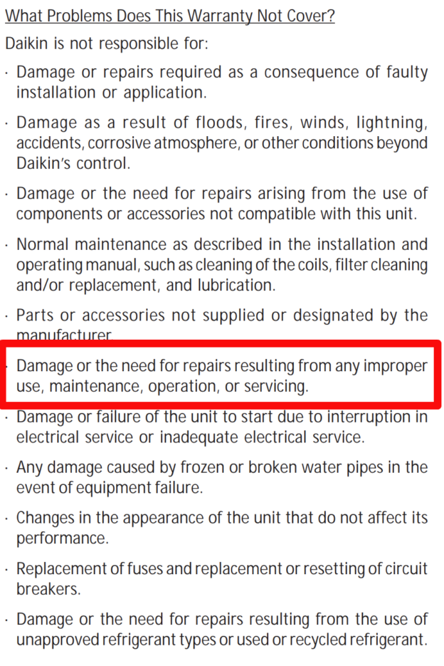 Example of an AC warranty that requires regular AC maintenance. Source: www.daikinac.com