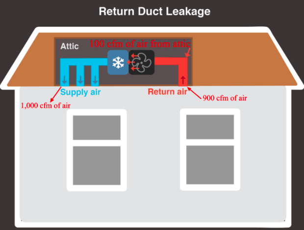 Now let’s say that your return ducts are designed to suck in around 1000 cfm (cubic feet per minute) of air. But leaks in the return ducts suck in about 100 cfm of air from unconditioned areas like the attic or basement. That means the return ducts only have to suck in 900 cfm from your home.